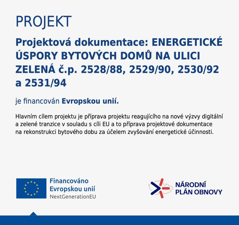 Cílem projektu je nejen snížení energetické náročnosti budov, ale také zlepšení celkového komfortu bydlení pro nájemníky. Dotace z Národního plánu obnovy byla určena na zpracování projektové dokumentace, která je nezbytným krokem v přípravné fázi rekonstrukce. Právě podpora těchto aktivit odpovídá úloze dotace – zvyšovat úspěšnost realizace projektů veřejného sektoru.